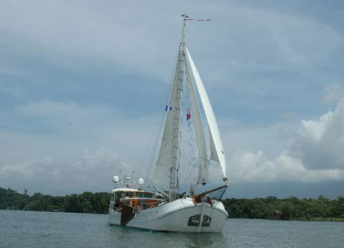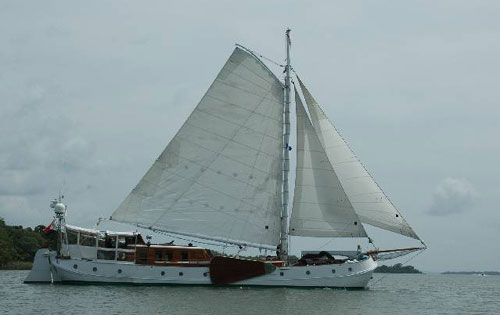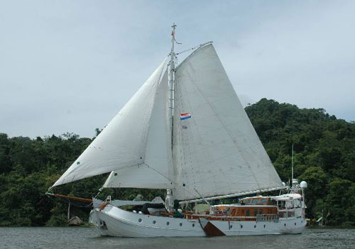 Feadship-De Vrouwe Christina This unique 83ft Feadship was built in 1957. A six million Euro refit was completed in 2005. She is a steel riveted hull with teak cabin sides and teak over steel decks. We keep the DVC in pristine condition at all times. She is functional as well as beautiful. From the outside she looks like her original design as a Dutch sailing Tjalk, but from the inside she is open and modern. She is powered by two Perkins Saber 300Kw main engines and two Kohler 35kw gen sets. She has been refit with every modern convenience including: electric winches, hydraulic bow/stern thrusters and windlass, a complete Miele galley, and a powerful air-conditioning system throughout. The navigation system is based around the Simrad and Micad touch screen with dual station readouts. A Fleet 55, Mini M, Global Star, SeaTel, and every other modern convince make this vessel state of the art. This brightly varnished boat is a show stopper. On the dock tourists line up to take photos and when underway vessels of all types cruise over to get a closer look at her beauty and charm. Scott is the Chief Engineer while Allison is the Captain. Under the care of Team Yachtwork, DVC, raised her sails for the first time in over two decades. The owners are living aboard full time along with Team Yachtwork. We departed Florida in June 2006 and visited Mexico, Belize, the Rio Dulce of Guatemala, Roatan, San Andreas, and completed three Panama Canal transits. I have included below some photos of the DVC working her way up the Rio Dulce. The current was almost three knots against us. Still the DVC was making constant headway in the light winds. This photo shows the lee boards in use.